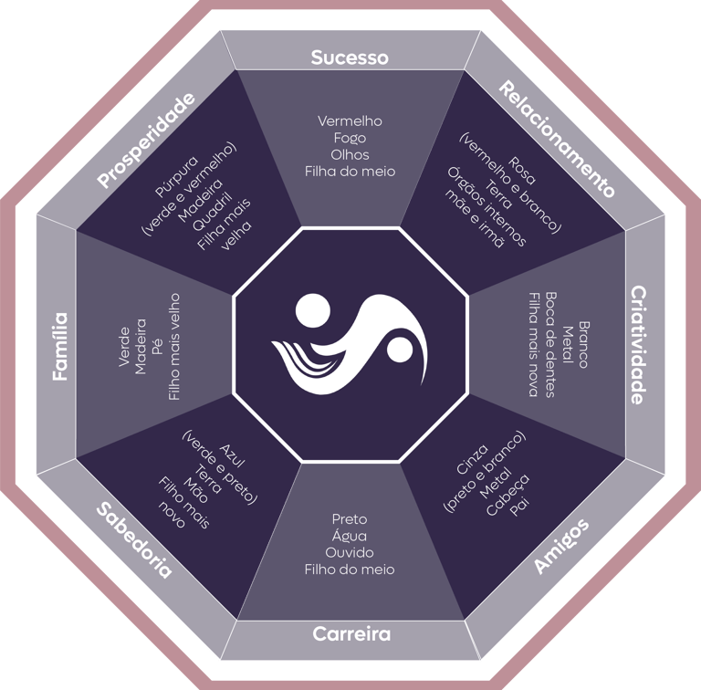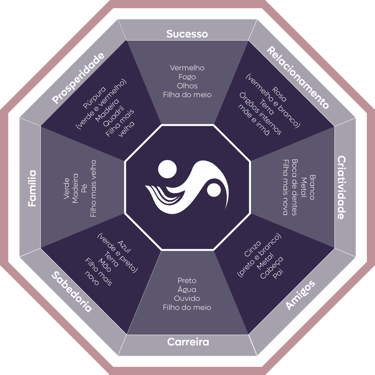 Mapeamento das 9 áreas da vida no seu espaço (Família, Prosperidade, Sucesso, Relacionamentos, Criatividade, Amigos, Trabalho, Espiritualidade e Saúde).